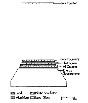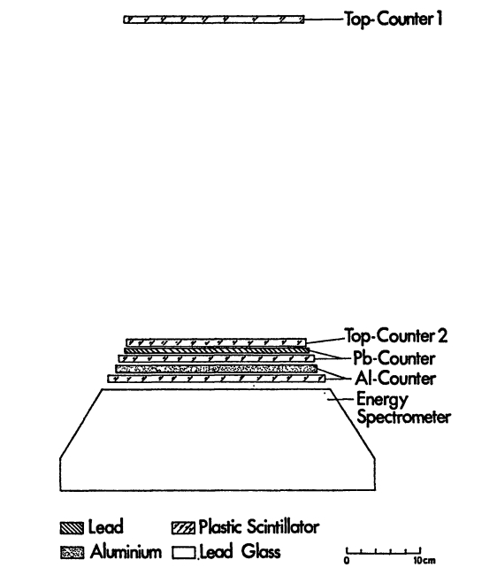 The instrument which can be seen schematically in the figure at left (click to enlarge) operated by determining electron fluxes with high precision, utilizing a combination of counters and a total absorption Cerenkov spectrometer. The configuration consisted of two telescope counters, designated as Top-Counter 1 (TC1) and Top-Counter 2 (TC2), which defined the detector's geometry factor at approximately 95 cm² sr, with a maximum half-angle acceptance of 30°. Positioned below TC2, a lead slab of 1 radiation length (r.l.) and a plastic scintillator formed the Pb-counter, while an aluminum slab of 0.1 r.l., also coupled with a plastic scintillator, functioned as the Al-counter. These components contributed to electron identification by registering energy deposition patterns characteristic of electrons passing through the instrument.