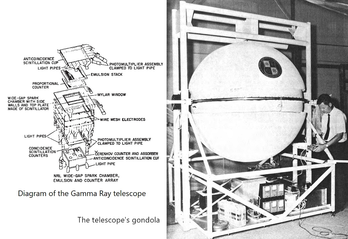In the image at left we can see the gondola containing the instrument (click for more details). It incorporated a stack of nuclear emulsions serving as a converter, where gamma rays interacted to produce electron pairs or Compton recoil electrons. These electrons then passed through a multi-wire proportional counter and a pair of plastic scintillation counters. An upper energy limit was imposed by a five-inch thick block of clear plexiglas positioned below the scintillation counters, which acted as both a stopper for the electrons and a Cerenkov counter to reject upward-moving gamma rays that might convert within it.