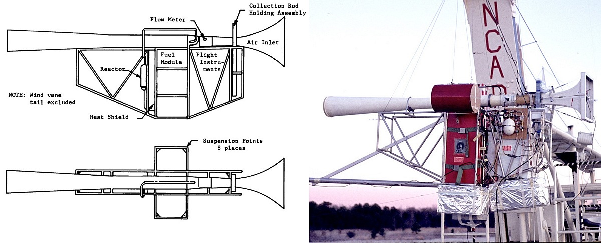 In the image at left we can see an scheme of the collector and an actual picture of it (click to enlarge). The pump that powered the collector measured four meters long and used an air ejector system driven by the catalytic decomposition of hydrazine, with 150 pounds of hydrazine stored on board. It was a modified version of the one developed by Litton for sampling stratospheric bomb debris from nuclear tests. Air was drawn through a horn-shaped inlet and passed over 22 cylindrical collection rods mounted perpendicular to the airstream. These rods, coated in silicone oil, trapped incoming particles by inertial deposition. The rods were each 0.25 inches in diameter and 2.25 inches long and were highly efficient at capturing particles larger than approximately 2 micrograms. Before and after the collection phase, the rods were sealed from contamination using a slide-gate mechanism, a butterfly valve, and a removable cover, all of which were critically cleaned in a class-100 cleanroom.