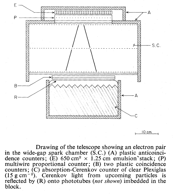Below the spark chamber, two 0.63-cm-thick plastic scintillation counters recorded charged particles passing through the system. These counters worked in coincidence with the proportional counter to ensure accurate particle detection. Surrounding the entire telescope were plastic anticoincidence counters, including an upper cup over the emulsion stack and proportional counter and a lower cup around the range-Cerenkov counter. Additional scintillation panels formed an anticoincidence shield around the spark chamber, preventing background interference from neutral particles converting in the chamber walls.
