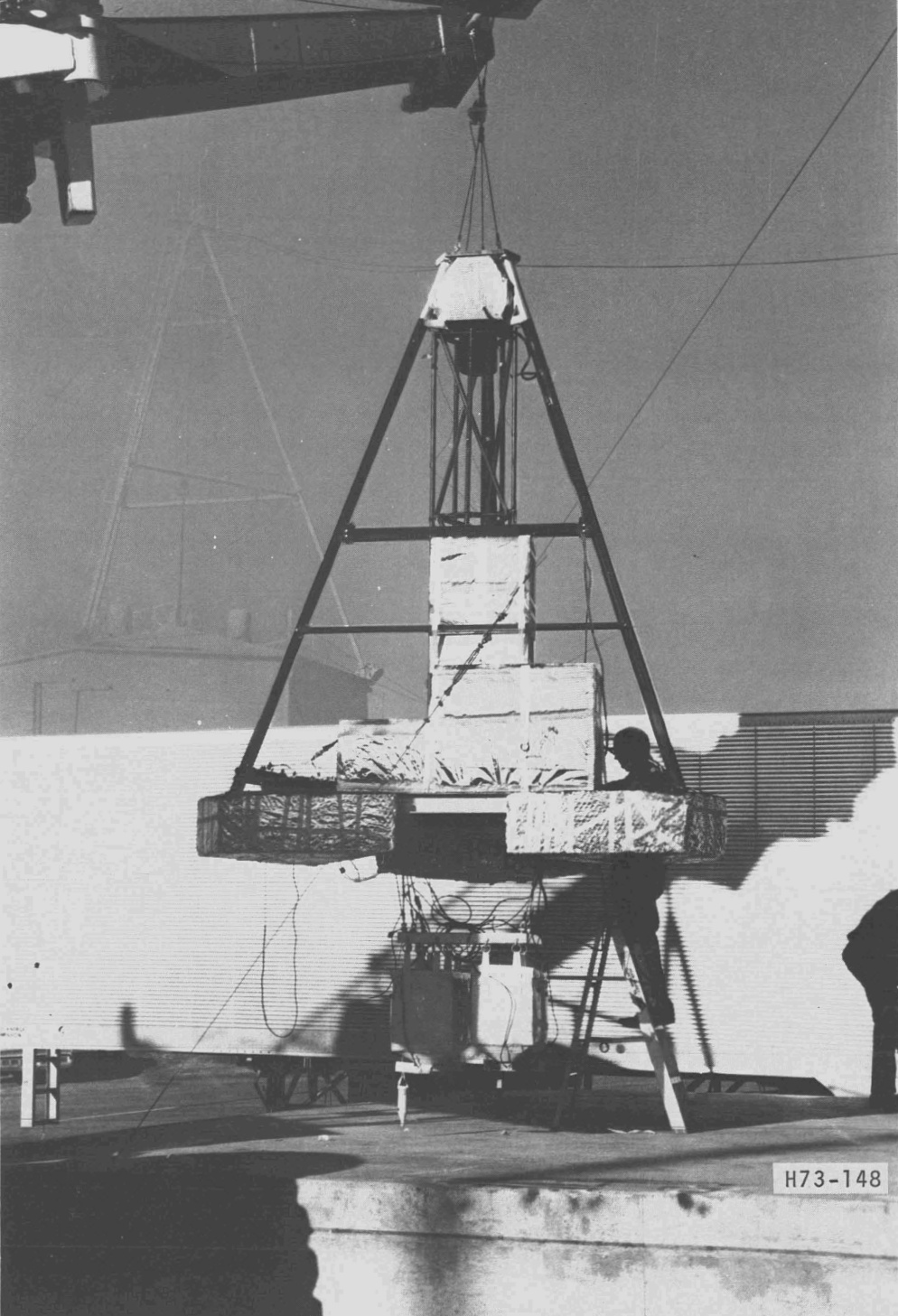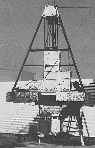 All these elements were mounted in a triangular-based tubular pyramid gondola that supported all the instruments. It provided an open framework to allow circulation of air, ozone, and nitric oxide, minimized blockage of sunlight, and held the two-meter-long vertical White Cell. The structure also carried the command and telemetry unit, ballast containers, and crushable cardboard pads in the bottom to absorn the landing shock.