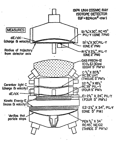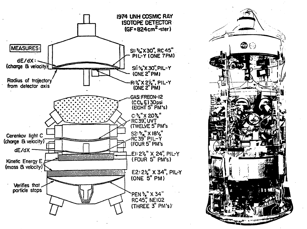 The apparatus (which can be seen schematically in the image at left) consisted of a multilayered telescope with various detection components arranged vertically. At the top were the thin scintillator detectors S1 and S2, which measured the rate of energy loss (dE/dx) and defined the geometry of the telescope. These were followed by the Cerenkov detector (C), which determined particle velocity and contributed to isotopic separation by exploiting the fact that heavier isotopes of the same charge and speed penetrate deeper into the subsequent energy counters.