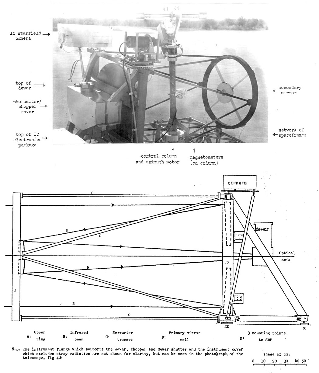 A key component of the system was the stabilized balloon platform (SBP) on which the telescope was mounted. It was designed and constructed by GEC Marconi Electronics Ltd. for the U.K. Science Research Council (SRC) and operated by a team from SRC's Appleton Laboratory. The gondola with dimensions of 10 feet by 15 feet by 9 feet high was stabilized in three axesazimuth, elevation, and rollusing a central gimbal-torque-motor cluster suspended from the balloon, with the balloon itself served as the reaction mass for azimuthal stabilization.