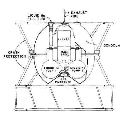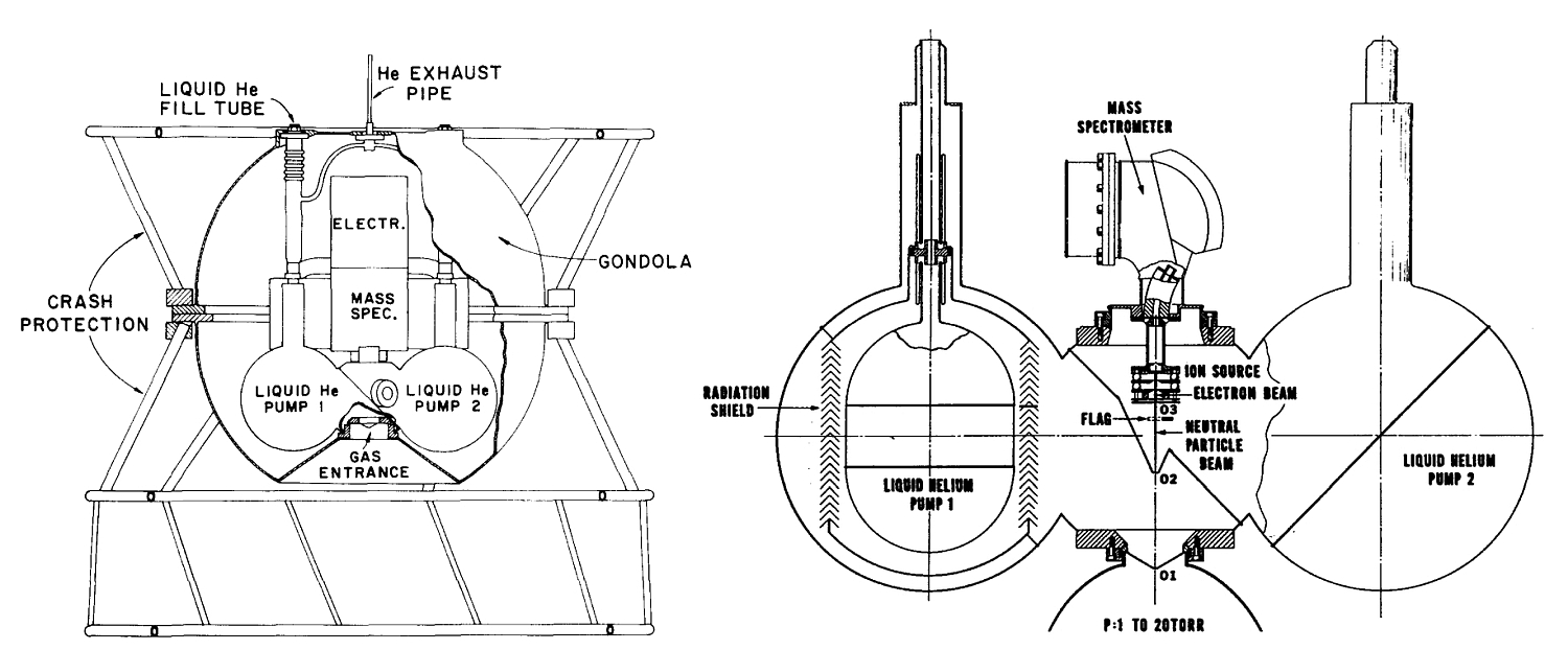 In the image at left we can see a scheme of the instrument in flight configuration (click for more details). The design of the instrument included a gas inlet system composed of two large spheres connected by a smaller central sphere. These spheres housed liquid helium pumps that provided the necessary pumping speed. A diaphragm within the center sphere created two separately pumped chambers. Ambient stratospheric gas particles entered through a small orifice, encountering a rapid pressure reduction facilitated by the liquid helium pumps. Molecules aligned with a second orifice passed into a subsequent chamber, where further pressure reduction occurred before the particles reached the ionization region of the mass spectrometer. The system's construction enabled a decrease in background pressure by more than four orders of magnitude, ensuring effective gas analysis in the low-pressure environment.