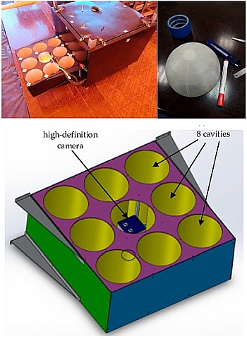 Objective of the flight was to simulate meteorite landings, supporting the analysis of organism survival in the near-space environment and the assessment of impact effects on potential life forms carried within meteorites. This experiment utilized a balloon-borne platform to investigate the plausibility of interstellar (or interplanetary) panspermia by replicating the meteorite entry and Earth impact process. The mechanical design of the simulated meteorite ejection system is depicted in the image at right (click to enlarge). It contains 8 cavities for storing simulated meteorites and a central cavity for installing a high-definition camera with a resolution of 1920 x 1080 pixels to record the release process.